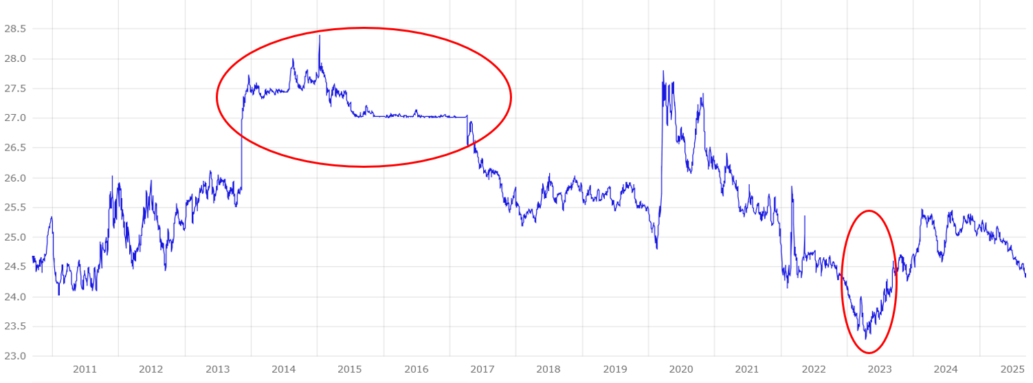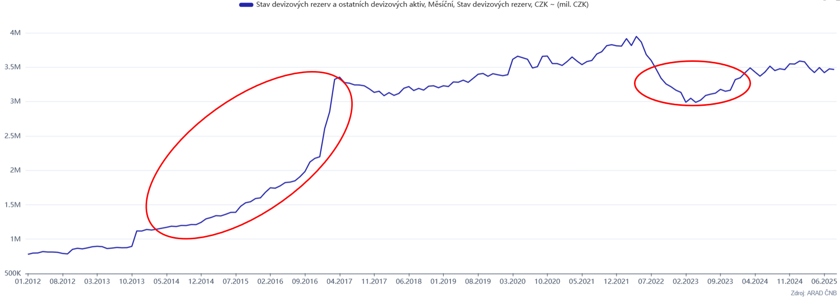 Údaj je přepočtem hodnoty devizových rezerv na korunovou hodnotu, protože devízy jsou zahraniční elektronické národní měny – cizí zákonná platidla (euro, libra, dolar). Stav se navyšuje tak, že ČNB vytvoří koruny a nabídne je českému bankovním sektoru za eura, která se na něm hojně vyskytují. K tomu vyřkne kurz, za který si přeje obchodovat. Pokud by šlo o kurz nižší, než je aktuálně na trhu, banky koruny nebudou chtít, protože nechtějí – stejně jako jakákoliv domácnost– vytvářet ztrátu. Pokud je tomu naopak, banky přijmou všechny nabízené koruny, zbaví se eur a vydělají na tom až dokud se nový tržní kurz neustálí na tom, který nabízí k obchodování ČNB. A to byla cena (nad) 27 Kč, za kterou se po pět let bez velkých výkyvů v našich končinách jedno euro obchodovalo. Když už jsme u grafu, pohlédněme na propad hodnoty devizových rezerv v roce 2023, a zároveň na posílení kurzu, kdy bylo možné euro pořídit za cenu pod 23,5. Zde ČNB utrácela devizové rezervy za nákup koruny, jejíž kurz také podléhá známým tržním silám, a tím jej posílila.