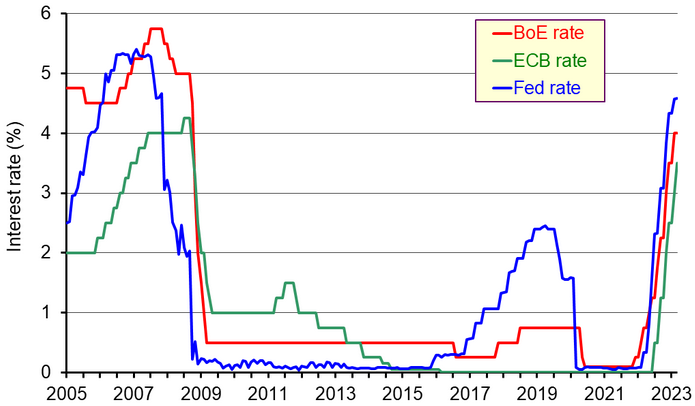 Graf: Úroková sazba vybraných světových bank v letech 2005–2023