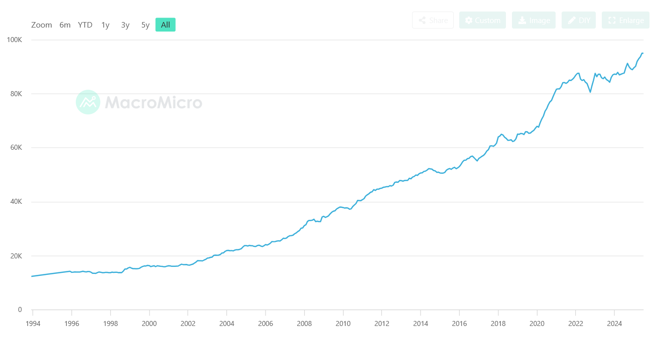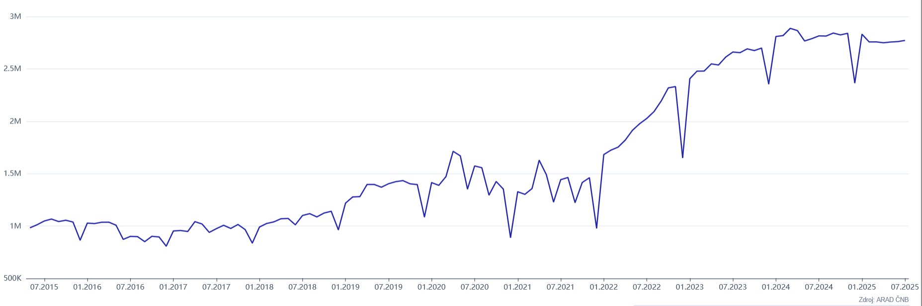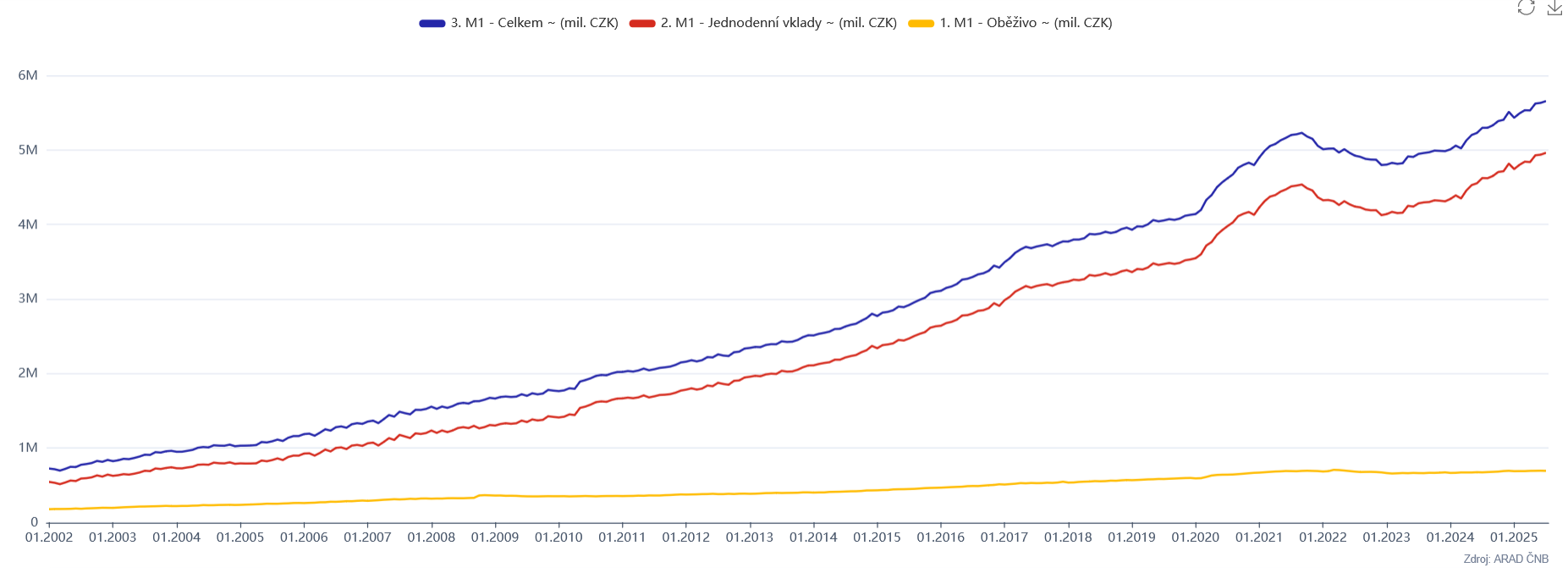 Graf: Počet Korun českých v letech 2002 až 2025 (osa v bilionech → 5M = 5 000 000 000 000)