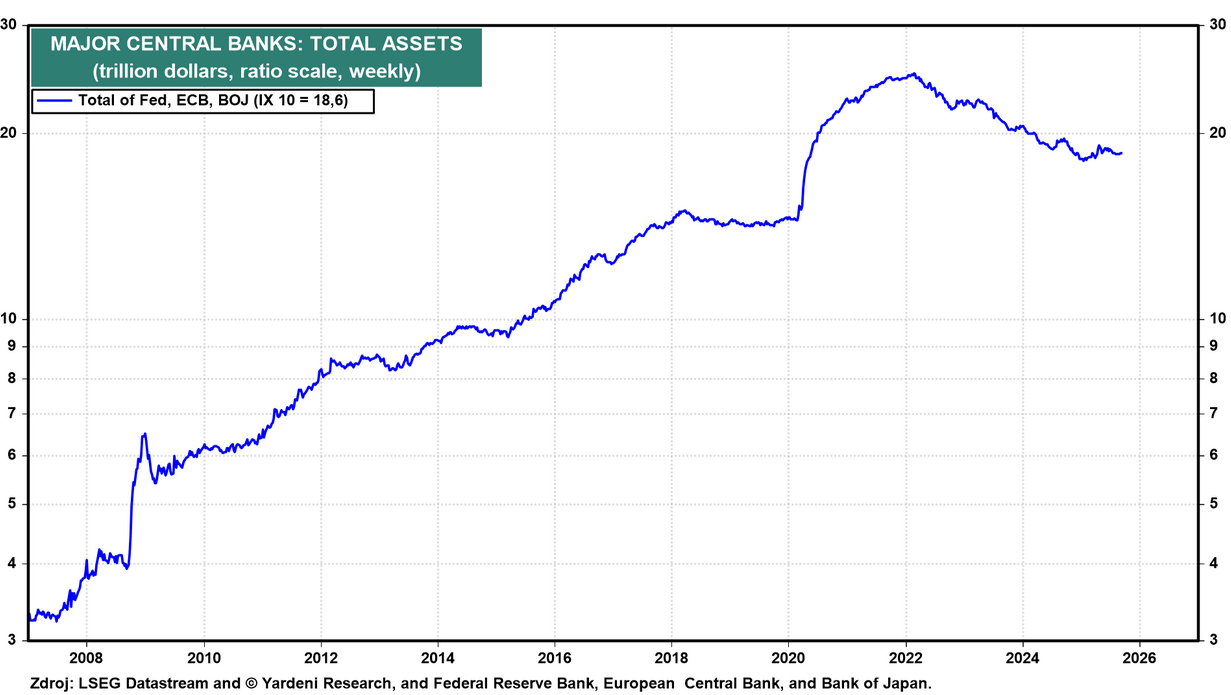 Graf: Aktiva centrálních bank USA, Eurozóny a Japonska v letech 2008 až 2025