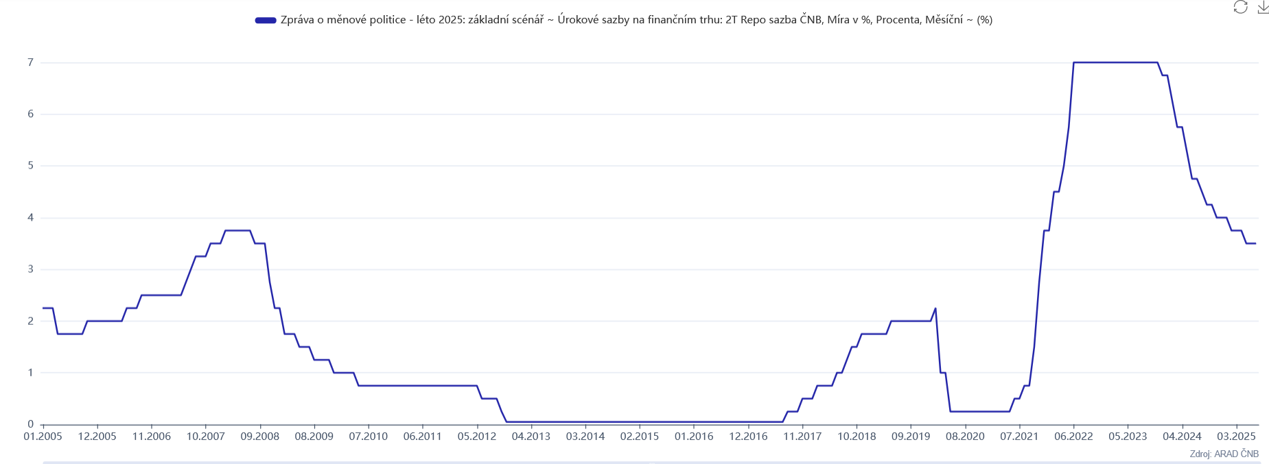 Graf: Průběh dvoutýdenní repo sazby v letech 2005 až 2025